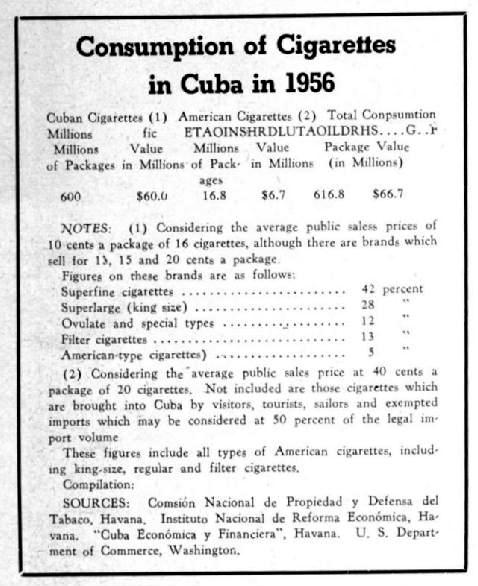 In somewhat more detail, cigarette consumption statistics from both Havana and Washington, D.C., show that in 1956 the Cuban people smoked 616,800,000 packages of both Cuban and American cigarettes, for which they paid $66.7 million Cuban pesos which are equivalent to American dollars.